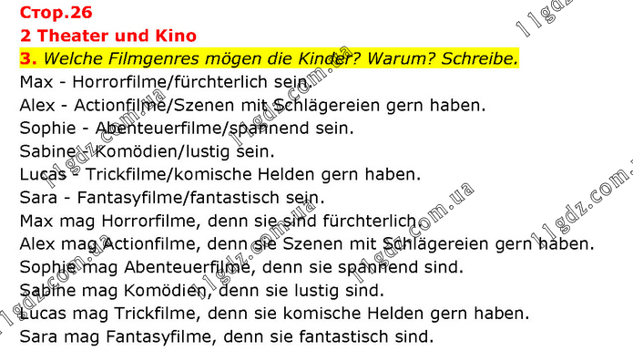 2 Theater und Kino 3. Welche Filmgenres mögen die Kinder? Warum? Schreibe. Max - Horrorfilme/fürchterlich sein. Alex - Actionfilme/Szenen mit Schlägereien gern haben. Sophie - Abenteuerfilme/spannend sein. Sabine - Komödien/lustig sein. Lucas - Trickfilme/komische Helden gern haben. Sara - Fantasyfilme/fantastisch sein. Max mag Horrorfilme, denn sie sind fürchterlich. Alex mag Actionfilme, denn sie Szenen mit Schlägereien gern haben. Sophie mag Abenteuerfilme, denn sie spannend sind. Sabine mag Komödien, denn sie lustig sind. Lucas mag Trickfilme, denn sie komische Helden gern haben. Sara mag Fantasyfilme, denn sie fantastisch sind.
