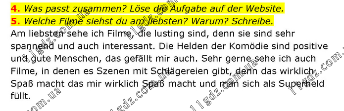 4. Was passt zusammen? Löse die Aufgabe auf der Website. 5. Welche Filme siehst du am liebsten? Warum? Schreibe. Am liebsten sehe ich Filme, die lusting sind, denn sie sind sehr spannend und auch interessant. Die Helden der Komödie sind positive und gute Menschen, das gefällt mir auch. Sehr gerne sehe ich auch Filme, in denen es Szenen mit Schlägereien gibt, denn das wirklich Spaß macht das mir wirklich Spaß macht und man sich als Superheld füllt.