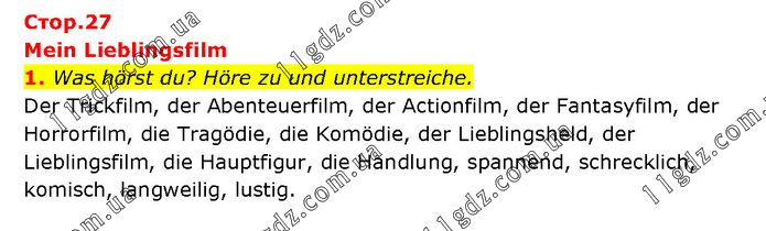 Mein Lieblingsfilm 1. Was hörst du? Höre zu und unterstreiche. Der Trickfilm, der Abenteuerfilm, der Actionfilm, der Fantasyfilm, der Horrorfilm, die Tragödie, die Komödie, der Lieblingsheld, der Lieblingsfilm, die Hauptfigur, die Handlung, spannend, schrecklich, komisch, langweilig, lustig.