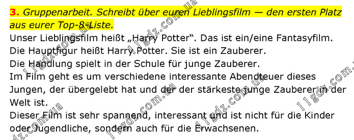 3. Gruppenarbeit. Schreibt über euren Lieblingsfilm — den ersten Platz aus eurer Top-8-Liste. Unser Lieblingsfilm heißt „Harry Potter“. Das ist ein/eine Fantasyfilm. Die Hauptfigur heißt Harry Potter. Sie ist ein Zauberer. Die Handlung spielt in der Schule für junge Zauberer. Im Film geht es um verschiedene interessante Abendteuer dieses Jungen, der übergelebt hat und der der stärkeste junge Zauberer in der Welt ist. Dieser Film ist sehr spannend, interessant und ist nicht für die Kinder oder Jugendliche, sondern auch für die Erwachsenen.