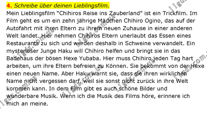 4. Schreibe über deinen Lieblingsfilm. Mein Lieblingsfilm “Chihiros Reise ins Zauberland” ist ein Trickfilm. Im Film geht es um ein zehn jährige Mädchen Chihiro Ogino, das auf der Autofahrt mit ihren Eltern zu ihrem neuen Zuhause in einer anderen Welt landet. Hier nehmen Chihiros Eltern unerlaubt das Essen eines Restaurants zu sich und werden deshalb in Schweine verwandelt. Ein mysteriöser Junge Haku will Chihiro helfen und bringt sie in das Badehaus der bösen Hexe Yubaba. Hier muss Chihiro jeden Tag hart arbeiten, um ihre Eltern befreien zu Können. Sie bekommt von der Hexe einen neuen Name. Aber Haku warnt sie, dass sie ihren wirklichen Name nicht vergessen darf, weil sie sonst nicht zurück in ihre Welt kommen kann. In dem Film gibt es auch schöne Bilder und wunderbare Musik. Wenn ich die Musik des Films höre, erinnere ich mich an meine.