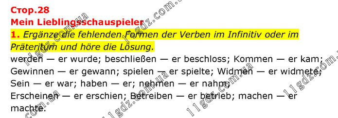 Mein Lieblingsschauspieler 1. Ergänze die fehlenden Formen der Verben im Infinitiv oder im Präteritum und höre die Lösung. werden — er wurde; beschließen — er beschloss; Kommen — er kam; Gewinnen — er gewann; spielen — er spielte; Widmen — er widmete; Sein — er war; haben — er; nehmen — er nahm; Erscheinen — er erschien; Betreiben — er betrieb; machen — er machte.