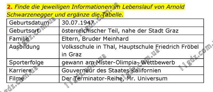 Finde die jeweiligen Informationen im Lebenslauf von Arnold Schwarzenegger und ergänze die Tabelle. Geburtsdatum 30.07.1947 Geburtsort österreichischer Teil, nahe der Stadt Graz Familie Eltern, Bruder Meinhard Ausbildung Volksschule in Thal, Hauptschule Friedrich Fröbel in Graz Sporterfolge gewann am Mister-Olimpia- Wettbewerb Karriere Gouverneur des Staates Kalifornien Filme Der Terminator-Reihe, Mr. Universum