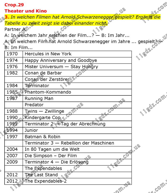 Theater und Kino 3. In welchen Filmen hat Arnold Schwarzenegger gespielt? Ergänzt die Tabelle zu zweit zeigt sie dabei einander nicht. Partner A. A: In welchem Jahr erschien der Film...? — B: Im Jahr... A: In welchem Film hat Arnold Schwarzenegger im Jahre ... gespielt? — B: Im Film...