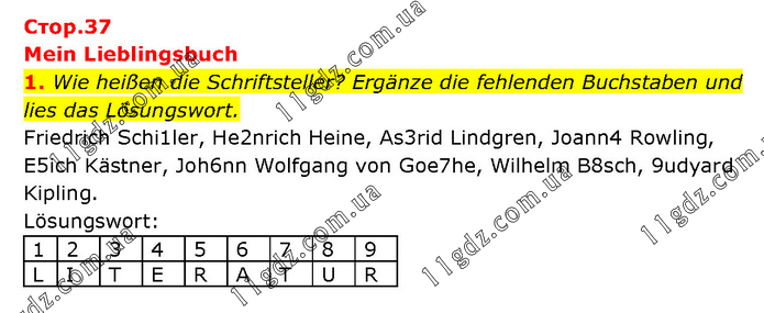 Mein Lieblingsbuch 1. Wie heißen die Schriftsteller? Ergänze die fehlenden Buchstaben und lies das Lösungswort. Friedrich Schi1ler, He2nrich Heine, As3rid Lindgren, Joann4 Rowling, E5ich Kästner, Joh6nn Wolfgang von Goe7he, Wilhelm B8sch, 9udyard Kipling. Lösungswort: