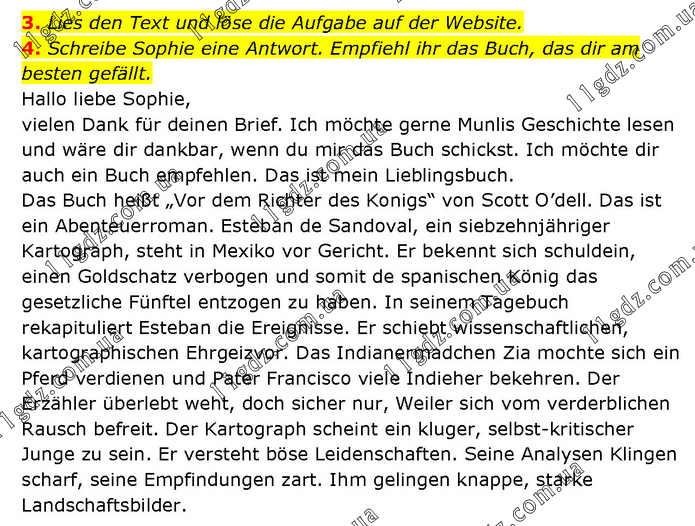 3. Lies den Text und löse die Aufgabe auf der Website. 4. Schreibe Sophie eine Antwort. Empfiehl ihr das Buch, das dir am besten gefällt. Hallo liebe Sophie, vielen Dank für deinen Brief. Ich möchte gerne Munlis Geschichte lesen und wäre dir dankbar, wenn du mir das Buch schickst. Ich möchte dir auch ein Buch empfehlen. Das ist mein Lieblingsbuch. Das Buch heißt „Vor dem Richter des Konigs“ von Scott O’dell. Das ist ein Abenteuerroman. Esteban de Sandoval, ein siebzehnjähriger Kartograph, steht in Mexiko vor Gericht. Er bekennt sich schuldein, einen Goldschatz verbogen und somit de spanischen König das gesetzliche Fünftel entzogen zu haben. In seinem Tagebuch rekapituliert Esteban die Ereignisse. Er schiebt wissenschaftlichen, kartographischen Ehrgeizvor. Das Indianermadchen Zia mochte sich ein Pferd verdienen und Pater Francisco viele Indieher bekehren. Der Erzähler überlebt weht, doch sicher nur, Weiler sich vom verderblichen Rausch befreit. Der Kartograph scheint ein kluger, selbst-kritischer Junge zu sein. Er versteht böse Leidenschaften. Seine Analysen Klingen scharf, seine Empfindungen zart. Ihm gelingen knappe, starke Landschaftsbilder.