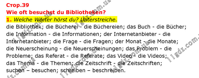 Wie oft besuchst du Bibliotheken? 1. Welche Wörter hörst du? Unterstreiche. die Bibliothek; die Bücherei - die Büchereien; das Buch - die Bücher; die Information - die Informationen; der Internetanbieter - die Internetanbieter; die Frage - die Fragen; der Monat - die Monate; die Neuerscheinung - die Neuerscheinungen; das Problem - die Probleme; das Referat - die Referate; das Video - die Videos; das Thema - die Themen; die Zeitschrift - die Zeitschriften; suchen – besuchen; schreiben – beschreiben.