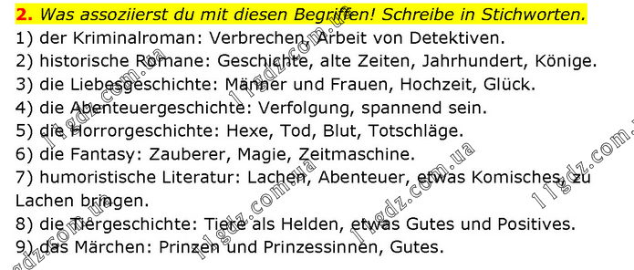 Was assoziierst du mit diesen Begriffen! Schreibe in Stichworten. 1) der Kriminalroman: Verbrechen, Arbeit von Detektiven. 2) historische Romane: Geschichte, alte Zeiten, Jahrhundert, Könige. 3) die Liebesgeschichte: Männer und Frauen, Hochzeit, Glück. 4) die Abenteuergeschichte: Verfolgung, spannend sein. 5) die Horrorgeschichte: Hexe, Tod, Blut, Totschläge. 6) die Fantasy: Zauberer, Magie, Zeitmaschine. 7) humoristische Literatur: Lachen, Abenteuer, etwas Komisches, zu Lachen bringen. 8) die Tiergeschichte: Tiere als Helden, etwas Gutes und Positives. 9) das Märchen: Prinzen und Prinzessinnen, Gutes.