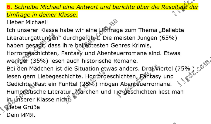 Schreibe Michael eine Antwort und berichte über die Resultate der Umfrage in deiner Klasse. Lieber Michael! Ich unserer Klasse habe wir eine Umfrage zum Thema „Beliebte Literaturgattungen“ durchgeführt. Die meisten Jungen (65%) haben gesagt, dass ihre beliebtesten Genres Krimis, Horrorgeschichten, Fantasy und Abenteuerromane sind. Etwas weniger (35%) lesen auch historische Romane. Bei den Mädchen ist die Situation etwas anders. Drei Viertel (75% ) lesen gern Liebegeschichte, Horrorgeschichten, Fantasy und Gedichte. Fast ein Fünftel (25%) mögen Abenteuerromane. Humoristische Literatur, Märchen und Tiergeschichten liest man in unserer Klasse nicht. Liebe Grüße Dein ИМЯ.