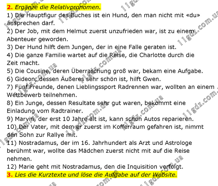 2. Ergänze die Relativpronomen. 1) Die Hauptfigur des Buches ist ein Hund, den man nicht mit «du» ansprechen darf. 2) Der Job, mit dem Helmut zuerst unzufrieden war, ist zu einem Abenteuer geworden. 3) Der Hund hilft dem Jungen, der in eine Falle geraten ist. 4) Die ganze Familie wartet auf die Reise, die Charlotte durch die Zeit macht. 5) Die Cousine, deren Überraschung groß war, bekam eine Aufgabe. 6) Gideon, dessen Äußeres sehr schön ist, hilft Gwen. 7) Fünf Freunde, denen Lieblingssport Radrennen war, wollten an einem Wettbewerb teilnehmen. 8) Ein Junge, dessen Resultate sehr gut waren, bekommt eine Einladung vom Radtrainer. 9) Marvin, der erst 10 Jahre alt ist, kann schon Autos reparieren. 10) Der Vater, mit dem er zuerst im Kofferraum gefahren ist, nimmt den Sohn zur Rallye mit. 11) Nostradamus, der im 16. Jahrhundert als Arzt und Astrologe berühmt war, wollte das Mädchen zuerst nicht mit auf die Reise nehmen. 12) Marie geht mit Nostradamus, den die Inquisition verfolgt.