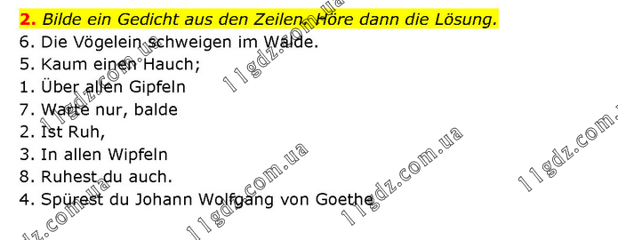 Bilde ein Gedicht aus den Zeilen. Höre dann die Lösung. 6. Die Vögelein schweigen im Walde. 5. Kaum einen Hauch; 1. Über allen Gipfeln 7. Warte nur, balde 2. Ist Ruh, 3. In allen Wipfeln 8. Ruhest du auch. 4. Spürest du Johann Wolfgang von Goethe