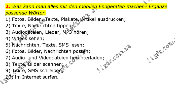 Was kann man alles mit den mobilen Endgeräten machen? Ergänze passende Wörter. 1) Fotos, Bilden, Texte, Plakate, Artikel ausdrucken; 2) Texte, Nachrichten tippen; 3) Audiodateien, Lieder, MP3 hören; 4) Videos sehen; 5) Nachrichten, Texte, SMS lesen; 6) Fotos, Bilder, Nachrichten posten; 7) Audio- und Videodateien herunterladen; 8) Texte, Bilder scannen; 9) Texte, SMS schreiben; 10) im Internet surfen.