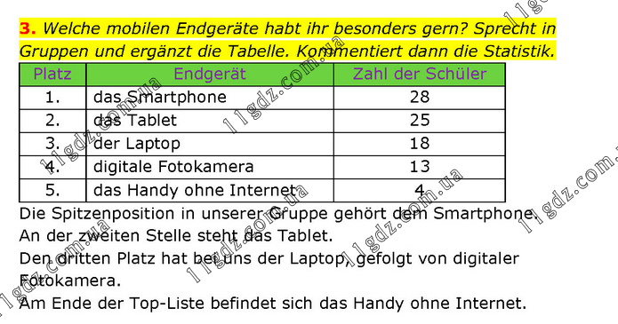 Welche mobilen Endgeräte habt ihr besonders gern? Sprecht in Gruppen und ergänzt die Tabelle. Kommentiert dann die Statistik. Platz Endgerät Zahl der Schüler 1. das Smartphone 28 2. das Tablet 25 3. der Laptop 18 4. digitale Fotokamera 13 5. das Handy ohne Internet 4 Die Spitzenposition in unserer Gruppe gehört dem Smartphone. An der zweiten Stelle steht das Tablet. Den dritten Platz hat bei uns der Laptop, gefolgt von digitaler Fotokamera. Am Ende der Top-Liste befindet sich das Handy ohne Internet.