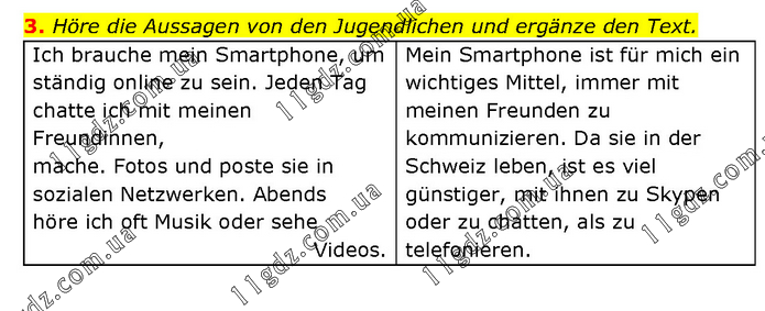 Höre die Aussagen von den Jugendlichen und ergänze den Text. Ich brauche mein Smartphone, um ständig online zu sein. Jeden Tag chatte ich mit meinen Freundinnen, mache. Fotos und poste sie in sozialen Netzwerken. Abends höre ich oft Musik oder sehe Videos. Mein Smartphone ist für mich ein wichtiges Mittel, immer mit meinen Freunden zu kommunizieren. Da sie in der Schweiz leben, ist es viel günstiger, mit ihnen zu Skypen oder zu chatten, als zu telefonieren.