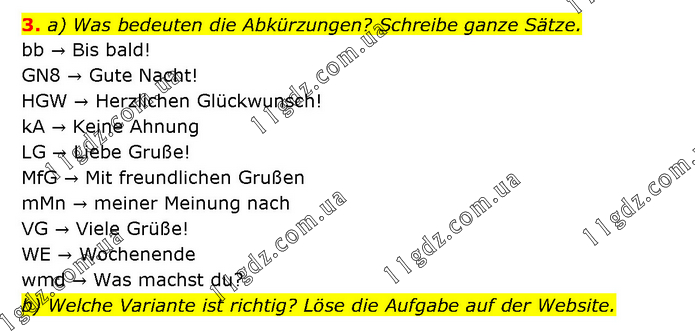 a) Was bedeuten die Abkürzungen? Schreibe ganze Sätze. bb → Bis bald! GN8 → Gute Nacht! HGW → Herzlichen Glückwunsch! kA → Keine Ahnung LG → Liebe Gruße! MfG → Mit freundlichen Grußen mMn → meiner Meinung nach VG → Viele Grüße! WE → Wochenende wmd → Was machst du?