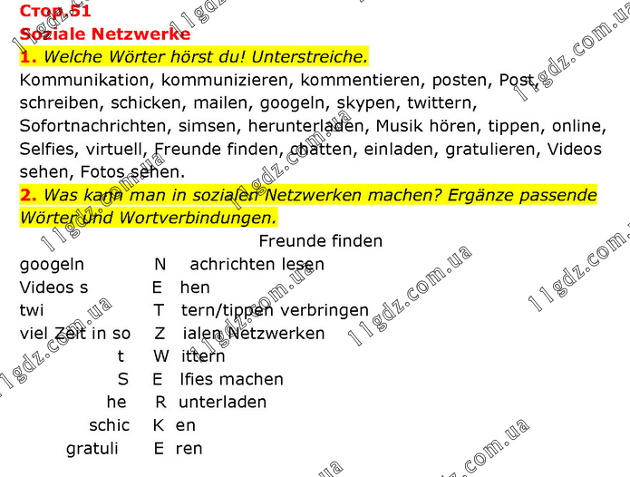 Soziale Netzwerke 1. Welche Wörter hörst du! Unterstreiche. Kommunikation, kommunizieren, kommentieren, posten, Post, schreiben, schicken, mailen, googeln, skypen, twittern, Sofortnachrichten, simsen, herunterladen, Musik hören, tippen, online, Selfies, virtuell, Freunde finden, chatten, einladen, gratulieren, Videos sehen, Fotos sehen. 2. Was kann man in sozialen Netzwerken machen? Ergänze passende Wörter und Wortverbindungen.