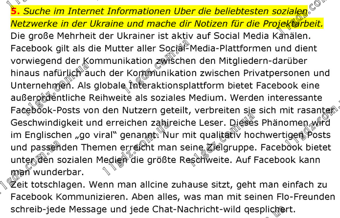 Suche im Internet Informationen Uber die beliebtesten sozialen Netzwerke in der Ukraine und mache dir Notizen für die Projektarbeit. Die große Mehrheit der Ukrainer ist aktiv auf Social Media Kanälen. Facebook gilt als die Mutter aller Social-Media-Plattformen und dient vorwiegend der Kommunikation zwischen den Mitgliedern-darüber hinaus nafürlich auch der Kommunikation zwischen Privatpersonen und Unternehmen. Als globale Interaktionsplattform bietet Facebook eine außerordentliche Reihweite als soziales Medium. Werden interessante Facebook-Posts von den Nutzern geteilt, verbreiten sie sich mit rasanter Geschwindigkeit und erreichen zahireiche Leser. Dieses Phänomen wird im Englischen „go viral“ genannt. Nur mit qualitativ hochwertigen Posts und passenden Themen erreicht man seine Zielgruppe. Facebook bietet unter den sozialen Medien die größte Reschweite. Auf Facebook kann man wunderbar. Zeit totschlagen. Wenn man allcine zuhause sitzt, geht man einfach zu Facebook Kommunizieren. Aben alles, was man mit seinen Flo-Freunden schreib-jede Message und jede Chat-Nachricht-wild qesplichert.