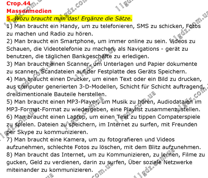 Massenmedien 5. Wozu braucht man das! Ergänze die Sätze. 1) Man braucht ein Handy, um zu telefonieren, SMS zu schicken, Fotos zu machen und Radio zu hören. 2) Man braucht ein Smartphone, um immer online zu sein. Videos zu Schauen, die Videotelefonie zu machen, als Navigations - gerät zu benutzen, die täglichen Bankgeschäfte zu erledigen. 3) Man braucht einen Scanner, um Unterlagen und Papier dokumente zu scannen. Scandateien auf der Festplatte des Geräts Speichern. 4) Man braucht einen Drucker, um einen Text oder ein Bild zu drucken, aus computer generierten 3-D-Modellen, Schicht für Schicht auftragend, dreidimentionale Bauteile herstellen. 5) Man braucht einen MP3-Player, um Musik zu hören, Audiodataien im MP3-Format-Format zu wiedergeben, eine Playlist zusammenzustellen. 6) Man braucht einen Laptop, um einen Text zu tippen Compaterspiele zu spielen. Dateien zu speichern, im Internet zu surfen, mit Freunden per Skype zu kommunizieren. 7) Man braucht eine Kamera, um zu fotografieren und Videos aufzunehmen, schlechte Fotos zu löschen, mit dem Blitz aufzunehmen. 8) Man braucht das Internet, um zu Kommunizieren, zu lernen, Filme zu gucken, Geld zu verdienen, darin zu surfen, Über soziale Netzwerke miteinander zu kommunizieren.