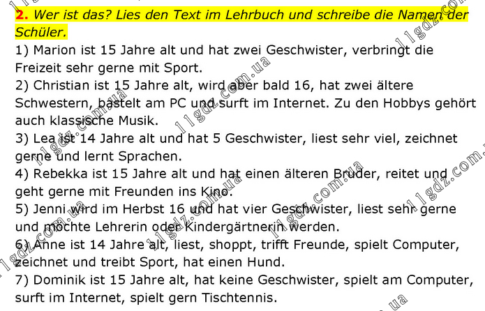 Wer ist das? Lies den Text im Lehrbuch und schreibe die Namen der Schüler. 1) Marion ist 15 Jahre alt und hat zwei Geschwister, verbringt die Freizeit sehr gerne mit Sport. 2) Christian ist 15 Jahre alt, wird aber bald 16, hat zwei ältere Schwestern, bastelt am PC und surft im Internet. Zu den Hobbys gehört auch klassische Musik. 3) Lea ist 14 Jahre alt und hat 5 Geschwister, liest sehr viel, zeichnet gerne und lernt Sprachen. 4) Rebekka ist 15 Jahre alt und hat einen älteren Bruder, reitet und geht gerne mit Freunden ins Kino. 5) Jenni wird im Herbst 16 und hat vier Geschwister, liest sehr gerne und möchte Lehrerin oder Kindergärtnerin werden. 6) Anne ist 14 Jahre alt, liest, shoppt, trifft Freunde, spielt Computer, zeichnet und treibt Sport, hat einen Hund. 7) Dominik ist 15 Jahre alt, hat keine Geschwister, spielt am Computer, surft im Internet, spielt gern Tischtennis.