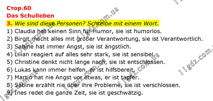 Das Schulleben 3. Wie sind diese Personen? Schreibe mit einem Wort. 1) Claudia hat keinen Sinn für Humor, sie ist humorlos. 2) Birgit macht alles mit großer Verantwortung, sie ist Verantwortlich. 3) Sabine hat immer Angst, sie ist ängstlich. 4) Lilian reagiert auf alles sehr stark, sie ist sensibel. 5) Christine denkt nicht lange nach, sie ist entschlossen. 6) Lukas kann immer helfen, er ist hilfsbereit. 7) Martin hat nie Angst vor etwas, er ist tapfer. 8) Sabine erzählt nie über ihre Probleme, sie ist verschlossen. 9) Ines redet die ganze Zeit, sie ist geschwätzig.
