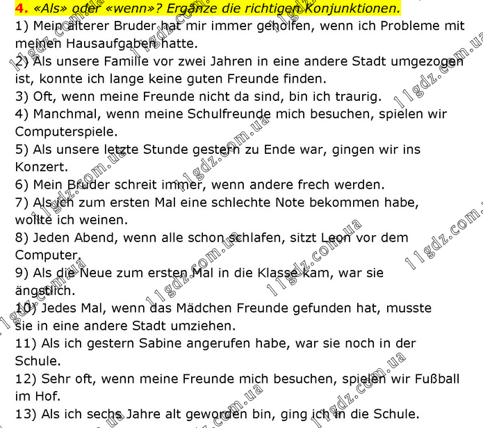 «Als» oder «wenn»? Ergänze die richtigen Konjunktionen. 1) Mein älterer Bruder hat mir immer geholfen, wenn ich Probleme mit meinen Hausaufgaben hatte. 2) Als unsere Familie vor zwei Jahren in eine andere Stadt umgezogen ist, konnte ich lange keine guten Freunde finden. 3) Oft, wenn meine Freunde nicht da sind, bin ich traurig. 4) Manchmal, wenn meine Schulfreunde mich besuchen, spielen wir Computerspiele. 5) Als unsere letzte Stunde gestern zu Ende war, gingen wir ins Konzert. 6) Mein Bruder schreit immer, wenn andere frech werden. 7) Als ich zum ersten Mal eine schlechte Note bekommen habe, wollte ich weinen. 8) Jeden Abend, wenn alle schon schlafen, sitzt Leon vor dem Computer. 9) Als die Neue zum ersten Mal in die Klasse kam, war sie ängstlich. 10) Jedes Mal, wenn das Mädchen Freunde gefunden hat, musste sie in eine andere Stadt umziehen. 11) Als ich gestern Sabine angerufen habe, war sie noch in der Schule. 12) Sehr oft, wenn meine Freunde mich besuchen, spielen wir Fußball im Hof. 13) Als ich sechs Jahre alt geworden bin, ging ich in die Schule.