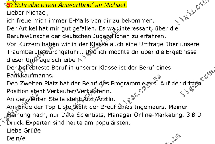 Schreibe einen Antwortbrief an Michael. Lieber Michael, ich freue mich immer E-Mails von dir zu bekommen. Der Artikel hat mir gut gefallen. Es war interessant, über die Berufswünsche der deutschen Jugendlichen zu erfahren. Vor Kurzem haben wir in der Klasse auch eine Umfrage über unsere Traumberufe durchgeführt. Und ich möchte dir über die Ergebnisse dieser Umfrage schreiben. Der beliebteste Beruf in unserer Klasse ist der Beruf eines Bankkaufmanns. Den Zweiten Platz hat der Beruf des Programmierers. Auf der dritten Position steht Verkaufer/Verkäuferin. An der vierten Stelle steht Arzt/Ärztin. Am Ende der Top-Liste steht der Breuf eines Ingenieurs. Meiner Meinung nach, nur Data Scientists, Manager Online-Marketing. 3 ß D Druck-Experten sind heute am populärsten. Liebe Grüße Dein/e