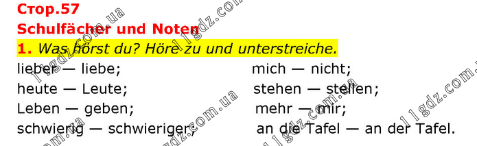 Schulfächer und Noten 1. Was hörst du? Höre zu und unterstreiche. lieber — liebe; mich — nicht; heute — Leute; stehen — stellen; Leben — geben; mehr — mir; schwierig — schwieriger; an die Tafel — an der Tafel.