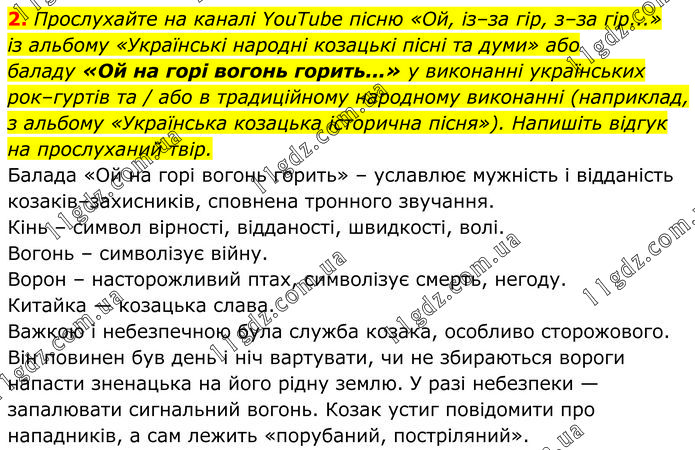 Прослухайте на каналі YouTube пісню «Ой, із–за гір, з–за гір...» із альбому «Українські народні козацькі пісні та думи» або баладу «Ой на горі вогонь горить...» у виконанні українських рок–гуртів та / або в традиційному народному виконанні (наприклад, з альбому «Українська козацька історична пісня»). Напишіть відгук на прослуханий твір. Балада «Ой на горі вогонь горить» – уславлює мужність і відданість козаків–захисників, сповнена тронного звучання. Кінь – символ вірності, відданості, швидкості, волі. Вогонь – символізує війну. Ворон – насторожливий птах, символізує смерть, негоду. Китайка — козацька слава. Важкою і небезпечною була служба козака, особливо сторожового. Він повинен був день і ніч вартувати, чи не збираються вороги напасти зненацька на його рідну землю. У разі небезпеки — запалювати сигнальний вогонь. Козак устиг повідомити про нападників, а сам лежить «порубаний, постріляний».