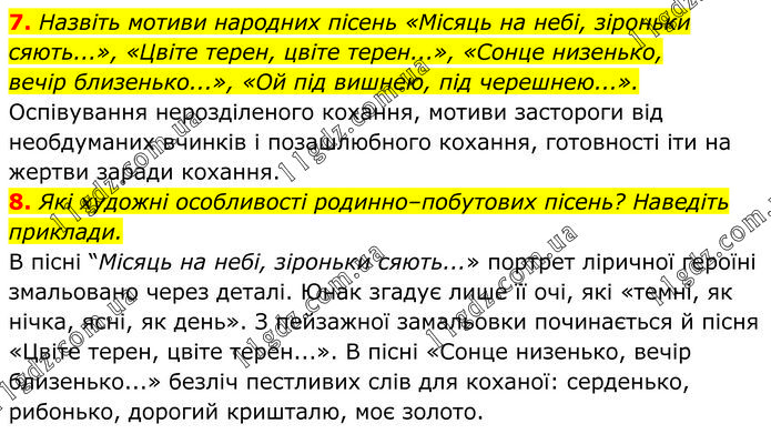 7. Назвіть мотиви народних пісень «Місяць на небі, зіроньки сяють...», «Цвіте терен, цвіте терен...», «Сонце низенько, вечір близенько...», «Ой під вишнею, під черешнею...». Оспівування нерозділеного кохання, мотиви застороги від необдуманих вчинків і позашлюбного кохання, готовності іти на жертви заради кохання. 8. Які художні особливості родинно–побутових пісень? Наведіть приклади. В пісні “Місяць на небі, зіроньки сяють...» портрет ліричної героїні змальовано через деталі. Юнак згадує лише її очі, які «темні, як нічка, ясні, як день». З пейзажної замальовки починається й пісня «Цвіте терен, цвіте терен...». В пісні «Сонце низенько, вечір близенько...» безліч пестливих слів для коханої: серденько, рибонько, дорогий кришталю, моє золото.