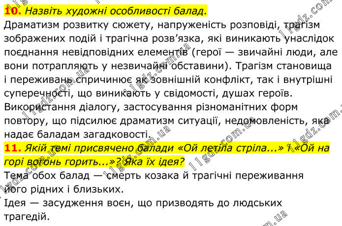 10. Назвіть художні особливості балад. Драматизм розвитку сюжету, напруженість розповіді, трагізм зображених подій і трагічна розв’язка, які виникають унаслідок поєднання невідповідних елементів (герої — звичайні люди, але вони потрапляють у незвичайні обставини). Трагізм становища і переживань спричинює як зовнішній конфлікт, так і внутрішні суперечності, що виникають у свідомості, душах героїв. Використання діалогу, застосування різноманітних форм повтору, що підсилює драматизм ситуації, недомовленість, яка надає баладам загадковості. 11. Якій темі присвячено балади «Ой летіла стріла...» і «Ой на горі вогонь горить...»? Яка їх ідея? Тема обох балад — смерть козака й трагічні переживання його рідних і близьких. Ідея — засудження воєн, що призводять до людських трагедій.