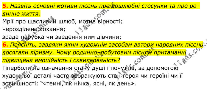 5. Назвіть основні мотиви пісень про дошлюбні стосунки та про родинне життя. Мрії про щасливий шлюб, мотив вірності; нерозділене кохання; зрада парубка чи зведення ним дівчини; 6. Поясніть, завдяки яким художнім засобам автори народних пісень досягали ліризму. Чому родинно–побутовим пісням притаманні підвищена емоційність і схвильованість? Гіперболи на означення стану душі і почуттів, за допомогою художньої деталі часто зображують стан героя чи героїні чи її зовнішності: “«темні, як нічка, ясні, як день».