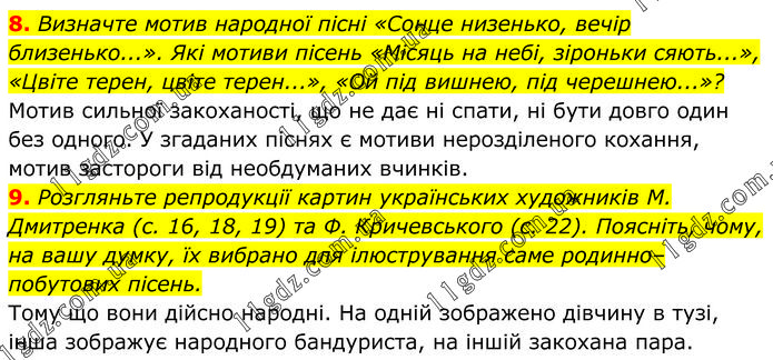 8. Визначте мотив народної пісні «Сонце низенько, вечір близенько...». Які мотиви пісень «Місяць на небі, зіроньки сяють...», «Цвіте терен, цвіте терен...», «Ой під вишнею, під черешнею...»? Мотив сильної закоханості, що не дає ні спати, ні бути довго один без одного. У згаданих піснях є мотиви нерозділеного кохання, мотив застороги від необдуманих вчинків. 9. Розгляньте репродукції картин українських художників М. Дмитренка (c. 16, 18, 19) та Ф. Кричевського (с. 22). Поясніть, чому, на вашу думку, їх вибрано для ілюстрування саме родинно–побутових пісень. Тому що вони дійсно народні. На одній зображено дівчину в тузі, інша зображує народного бандуриста, на іншій закохана пара.