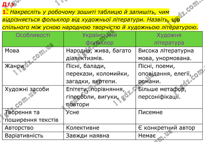 Накресліть у робочому зошиті таблицю й запишіть, чим відрізняється фольклор від художньої літератури. Назвіть, що спільного між усною народною творчістю й художньою літературою.
