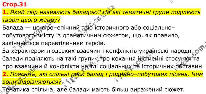 1. Який твір називають баладою? На які тематичні групи поділяють твори цього жанру? Балада — це ліро–епічний твір історичного або соціально– побутового змісту із драматичним сюжетом, що, як правило, закінчується перевтіленням героїв. За характером людських взаємин і конфліктів українські народні балади поділяють на такі групи: про кохання й сімейні стосунки та про взаємини й конфлікти на тлі соціальних та історичних обставин 2. Поясніть, які спільні риси балад і родинно–побутових пісень. Чим вони відрізняються? Тематика спільна, але балади мають більш виражений сюжет.