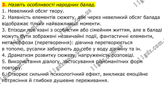 Назвіть особливості народних балад. 1. Невеликий обсяг твору. 2. Наявність елементів сюжету, але через невеликий обсяг балада відображає тільки найважливіші моменти. 3. Епізоди пов’язані з особистим або сімейним життям, але в баладі можуть бути зображені незвичайні події, фантастичні елементи, метаморфози (перетворення): дівчина перетворюється в тополю, русалки забирають до себе у воду дівчину та ін. 4. Драматизм розвитку сюжету, напруженість розповіді. 5. Використання діалогу, застосування різноманітних форм повтору. 6. Створює сильний психологічний ефект, викликає емоційне потрясіння й глибоке душевне переживання.