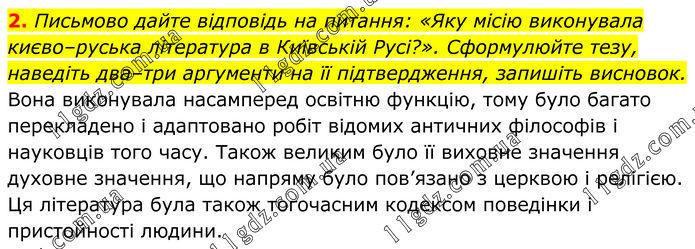Письмово дайте відповідь на питання: «Яку місію виконувала києво–руська література в Київській Русі?». Сформулюйте тезу, наведіть два–три аргументи на її підтвердження, запишіть висновок. Вона виконувала насамперед освітню функцію, тому було багато перекладено і адаптовано робіт відомих античних філософів і науковців того часу. Також великим було її виховне значення духовне значення, що напряму було пов’язано з церквою і релігією. Ця література була також тогочасним кодексом поведінки і пристойності людини.