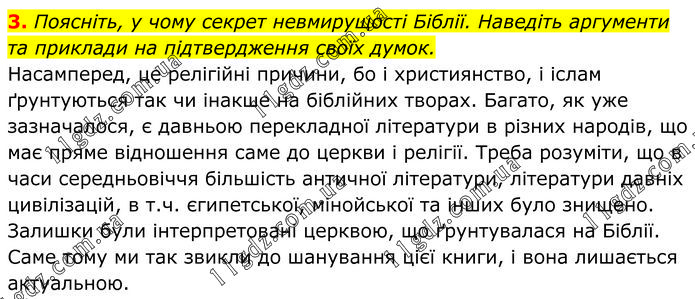 Поясніть, у чому секрет невмирущості Біблії. Наведіть аргументи та приклади на підтвердження своїх думок. Насамперед, це релігійні причини, бо і християнство, і іслам ґрунтуються так чи інакше на біблійних творах. Багато, як уже зазначалося, є давньою перекладної літератури в різних народів, що має пряме відношення саме до церкви і релігії. Треба розуміти, що в часи середньовіччя більшість античної літератури, літератури давніх цивілізацій, в т.ч. єгипетської, мінойської та інших було знищено. Залишки були інтерпретовані церквою, що ґрунтувалася на Біблії. Саме тому ми так звикли до шанування цієї книги, і вона лишається актуальною.