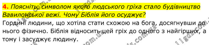 Поясніть, символом якого людського гріха стало будівництво Вавилонської вежі. Чому Біблія його осуджує? Гордині людини, що хотіла стати схожою на бога, досягнувши до нього фізично. Біблія відносить цей гріх до одного з найгірших, а тому і засуджує людину.