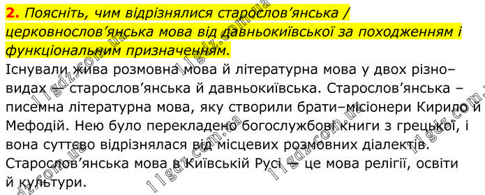 Поясніть, чим відрізнялися старослов’янська / церковнослов’янська мова від давньокиївської за походженням і функціональним призначенням. Існували жива розмовна мова й літературна мова у двох різно– видах — старослов’янська й давньокиївська. Старослов’янська – писемна літературна мова, яку створили брати–місіонери Кирило й Мефодій. Нею було перекладено богослужбові книги з грецької, і вона суттєво відрізнялася від місцевих розмовних діалектів. Старослов’янська мова в Київській Русі — це мова релігії, освіти й культури.