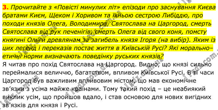 Прочитайте з «Повісті минулих літ» епізоди про заснування Києва братами Києм, Щеком і Хоривом та їхньою сестрою Либіддю, про походи князів Олега, Володимира, Святослава на Царгород, смерть Святослава від рук печенігів, смерть Олега від свого коня, помсту княгині Ольги древлянам за загибель князя Ігоря (на вибір). Яким із цих легенд і переказів постає життя в Київській Русі? Які морально–етичні норми визначають поведінку руських князів? Я читав про похід Святослава на Царгород. Видно, що князі сильно переймалися величчю, багатством, впливом Київської Русі. В ті часи Царгород був важливим впливовим містом, що мав економічне зв’язки з усіма майже країнами. Тому такий похід – це неабиякий виклик усім, що пройшов вдало, і став основою для нових вигідних зв’язків для князя і Русі.