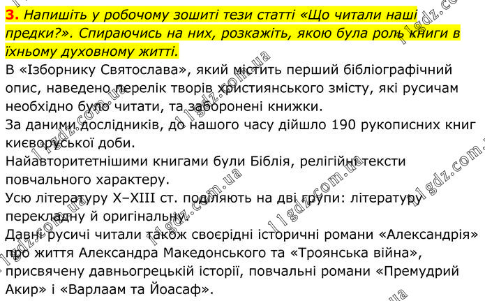 Напишіть у робочому зошиті тези статті «Що читали наші предки?». Спираючись на них, розкажіть, якою була роль книги в їхньому духовному житті. В «Ізборнику Святослава», який містить перший бібліографічний опис, наведено перелік творів християнського змісту, які русичам необхідно було читати, та заборонені книжки. За даними дослідників, до нашого часу дійшло 190 рукописних книг києворуської доби. Найавторитетнішими книгами були Біблія, релігійні тексти повчального характеру. Усю літературу Х–ХІІІ ст. поділяють на дві групи: літературу перекладну й оригінальну. Давні русичі читали також своєрідні історичні романи «Александрія» про життя Александра Македонського та «Троянська війна», присвячену давньогрецькій історії, повчальні романи «Премудрий Акир» і «Варлаам та Йоасаф».