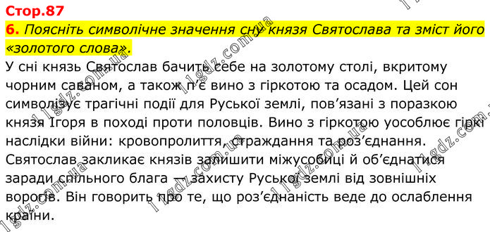 Поясніть символічне значення сну князя Святослава та зміст його «золотого слова». У сні князь Святослав бачить себе на золотому столі, вкритому чорним саваном, а також п’є вино з гіркотою та осадом. Цей сон символізує трагічні події для Руської землі, пов’язані з поразкою князя Ігоря в поході проти половців. Вино з гіркотою уособлює гіркі наслідки війни: кровопролиття, страждання та роз’єднання. Святослав закликає князів залишити міжусобиці й об’єднатися заради спільного блага — захисту Руської землі від зовнішніх ворогів. Він говорить про те, що роз’єднаність веде до ослаблення країни.