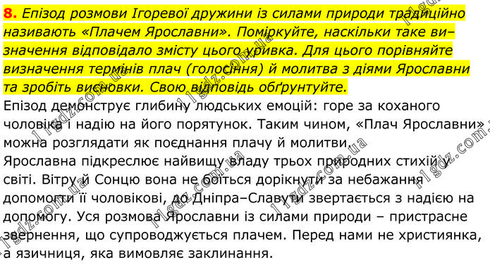 Епізод розмови Ігоревої дружини із силами природи традиційно називають «Плачем Ярославни». Поміркуйте, наскільки таке визначення відповідало змісту цього уривка. Для цього порівняйте визначення термінів плач (голосіння) й молитва з діями Ярославни та зробіть висновки. Свою відповідь обґрунтуйте. Епізод демонструє глибину людських емоцій: горе за коханого чоловіка і надію на його порятунок. Таким чином, «Плач Ярославни» можна розглядати як поєднання плачу й молитви. Ярославна підкреслює найвищу владу трьох природних стихій у світі. Вітру й Сонцю вона не боїться дорікнути за небажання допомогти її чоловікові, до Дніпра–Славути звертається з надією на допомогу. Уся розмова Ярославни із силами природи – пристрасне звернення, що супроводжується плачем. Перед нами не християнка, а язичниця, яка вимовляє заклинання.