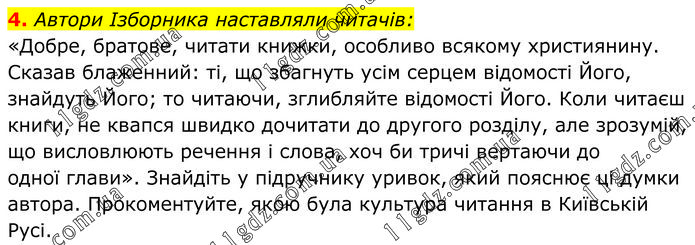 Автори Ізборника наставляли читачів: «Добре, братове, читати книжки, особливо всякому християнину. Сказав блаженний: ті, що збагнуть усім серцем відомості Його, знайдуть Його; то читаючи, зглибляйте відомості Його. Коли читаєш книги, не квапся швидко дочитати до другого розділу, але зрозумій, що висловлюють речення і слова, хоч би тричі вертаючи до одної глави». Знайдіть у підручнику уривок, який пояснює ці думки автора. Прокоментуйте, якою була культура читання в Київській Русі.