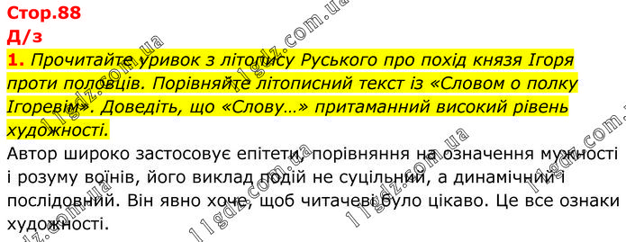Прочитайте уривок з літопису Руського про похід князя Ігоря проти половців. Порівняйте літописний текст із «Словом о полку Ігоревім». Доведіть, що «Слову…» притаманний високий рівень художності. Автор широко застосовує епітети, порівняння на означення мужності і розуму воїнів, його виклад подій не суцільний, а динамічний і послідовний. Він явно хоче, щоб читачеві було цікаво. Це все ознаки художності.