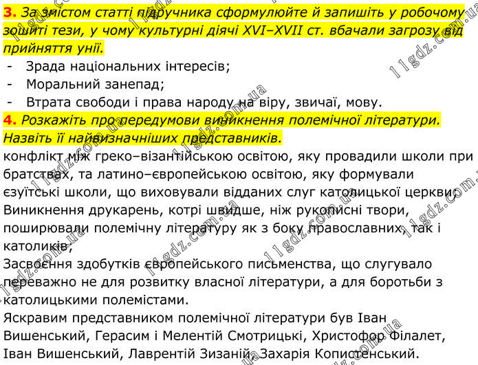 3. За змістом статті підручника сформулюйте й запишіть у робочому зошиті тези, у чому культурні діячі XVI–XVII ст. вбачали загрозу від прийняття унії. - Зрада національних інтересів; - Моральний занепад; - Втрата свободи і права народу на віру, звичаї, мову. 4. Розкажіть про передумови виникнення полемічної літератури. Назвіть її найвизначніших представників. Конфлікт між греко–візантійською освітою, яку провадили школи при братствах, та латино–європейською освітою, яку формували єзуїтські школи, що виховували відданих слуг католицької церкви; Виникнення друкарень, котрі швидше, ніж рукописні твори, поширювали полемічну літературу як з боку православних, так і католиків; Засвоєння здобутків європейського письменства, що слугувало переважно не для розвитку власної літератури, а для боротьби з католицькими полемістами. Яскравим представником полемічної літератури був Іван Вишенський, Герасим і Мелентій Смотрицькі, Христофор Філалет, Іван Вишенський, Лаврентій Зизаній, Захарія Копистенський.