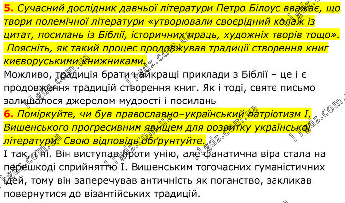 5. Сучасний дослідник давньої літератури Петро Білоус вважає, що твори полемічної літератури «утворювали своєрідний колаж із цитат, посилань із Біблії, історичних праць, художніх творів тощо». Поясніть, як такий процес продовжував традиції створення книг києворуськими книжниками. Можливо, традиція брати найкращі приклади з Біблії – це і є продовження традицій створення книг. Як і тоді, святе письмо залишалося джерелом мудрості і посилань. 6. Поміркуйте, чи був православно–український патріотизм І. Вишенського прогресивним явищем для розвитку української літератури. Свою відповідь обґрунтуйте. І так, і ні. Він виступав проти унію, але фанатична віра стала на перешкоді сприйняттю І. Вишенським тогочасних гуманістичних ідей, тому він заперечував античність як поганство, закликав повернутися до візантійських традицій.