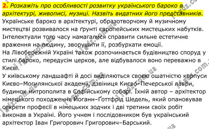 Розкажіть про особливості розвитку українського бароко в архітектурі, живописі, музиці. Назвіть видатних його представників. Українське бароко в архітектурі, образотворчому й музичному мистецтві розвивалося на ґрунті європейських мистецьких набутків. Інтелектуали того часу намагалися справити сильне естетичне враження на людину, зворушити її, розбурхати емоції. На Лівобережній Україні також розпочинається будівництво споруд у стилі бароко, передусім церков, але відбувалося воно переважно в Києві. У київському ландшафті й досі виділяються своєю ошатністю корпуси Києво–Могилянської академії, дзвіниця Києво–Печерської лаври, будинок митрополита в Софійському соборі. Їхній автор – архітектор німецького походження Йоганн–Ґоттфрід Шедель, який опановував секрети професії в німецьких зодчих і дві третини своїх робіт виконав в Україні. Його учнем і послідовником був український архітектор Іван Григорович Григорович–Барський.