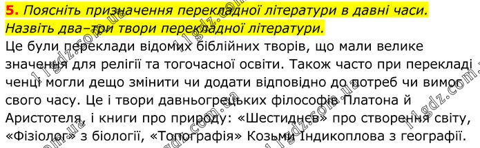 Поясніть призначення перекладної літератури в давні часи. Назвіть два–три твори перекладної літератури. Це були переклади відомих біблійних творів, що мали велике значення для релігії та тогочасної освіти. Також часто при перекладі ченці могли дещо змінити чи додати відповідно до потреб чи вимог свого часу. Це і твори давньогрецьких філософів Платона й Аристотеля, і книги про природу: «Шестиднєв» про створення світу, «Фізіолог» з біології, «Топографія» Козьми Індикоплова з географії.