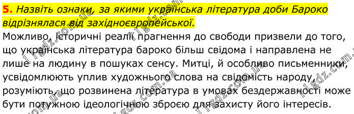 Назвіть ознаки, за якими українська література доби Бароко відрізнялася від західноєвропейської. Можливо, історичні реалії прагнення до свободи призвели до того, що українська література бароко більш свідома і направлена не лише на людину в пошуках сенсу. Митці, й особливо письменники, усвідомлюють уплив художнього слова на свідомість народу, розуміють, що розвинена література в умовах бездержавності може бути потужною ідеологічною зброєю для захисту його інтересів.